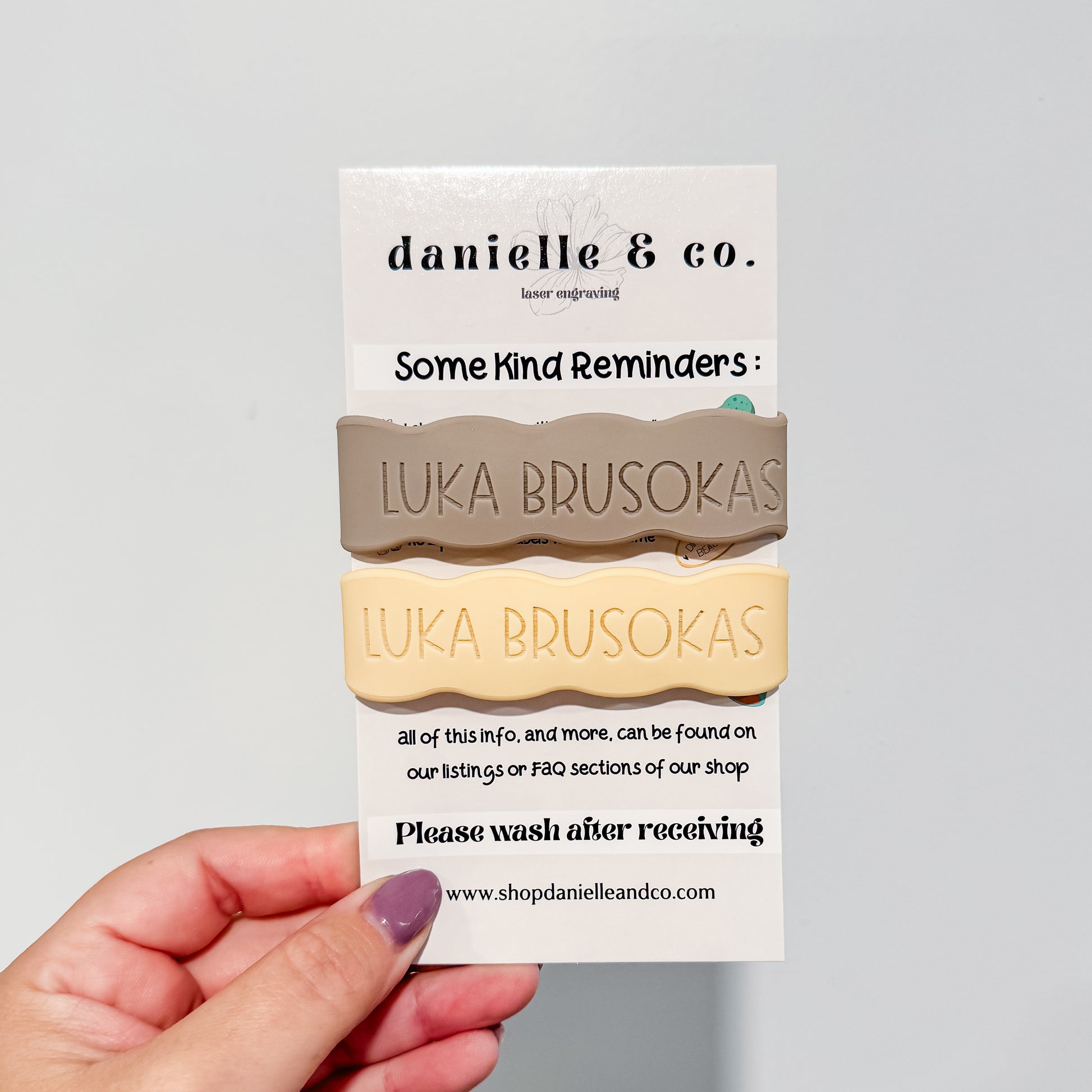 Please note: Lots of factors play into how a name will engrave. A few of those factors are font choice, name length and color of the band. If you have any questions prior to ordering about what will work best please reach out before ordering.