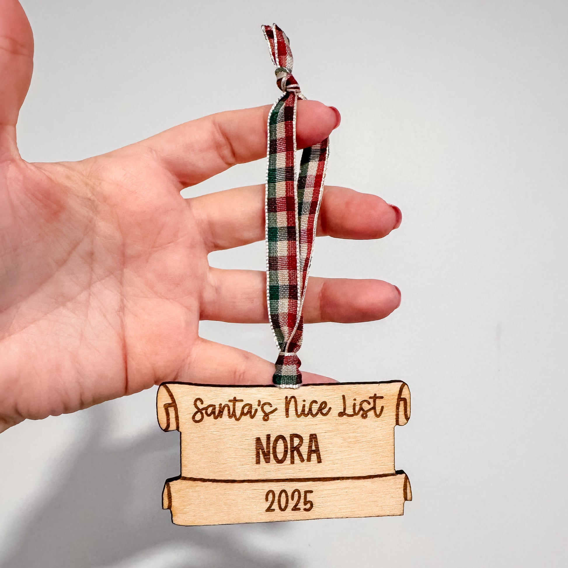 Our personalized Santa list is made with 3mm birch and finished off with coordinating holiday string.